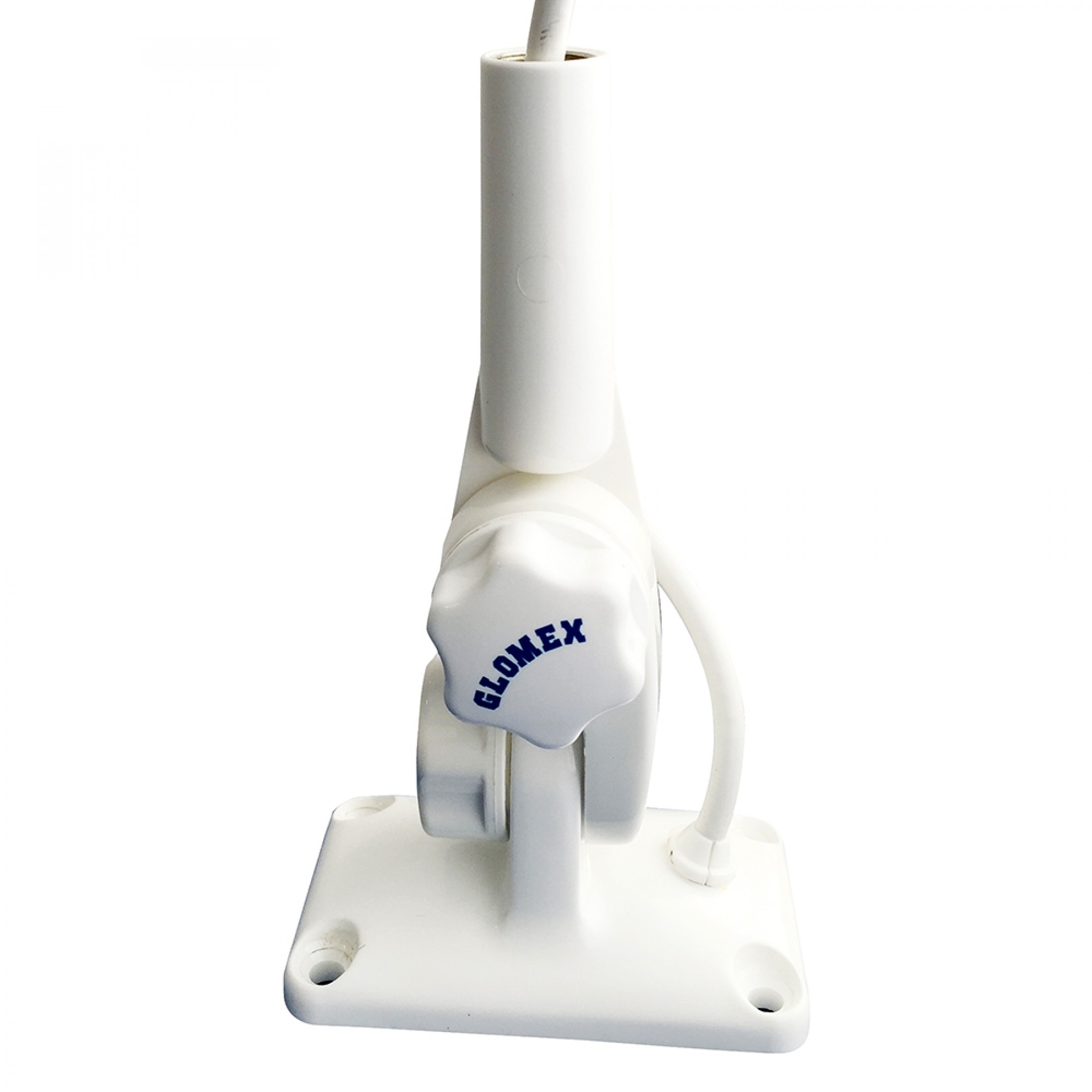4 way ratchet mount in reinforced nylon UV resistant design with knob, for deck or bulkhead. Hole and feed-thru for coax cable. Usable with Glomeasy antennas: RA106SLSFME, R106GRPFME and RA300.