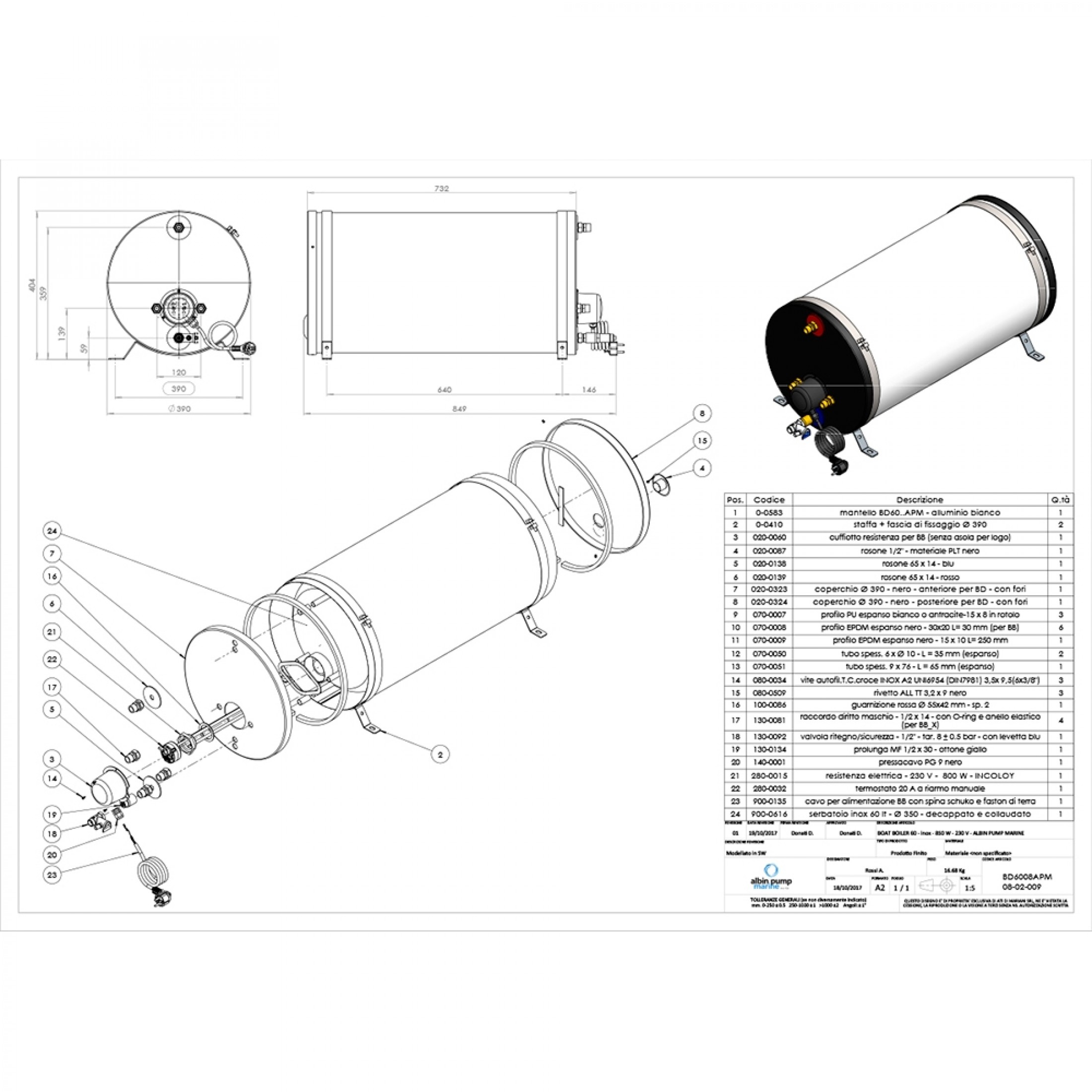 Marine SS Water Heater 60L (17 gal) 850W 230V, stainless steel tank.