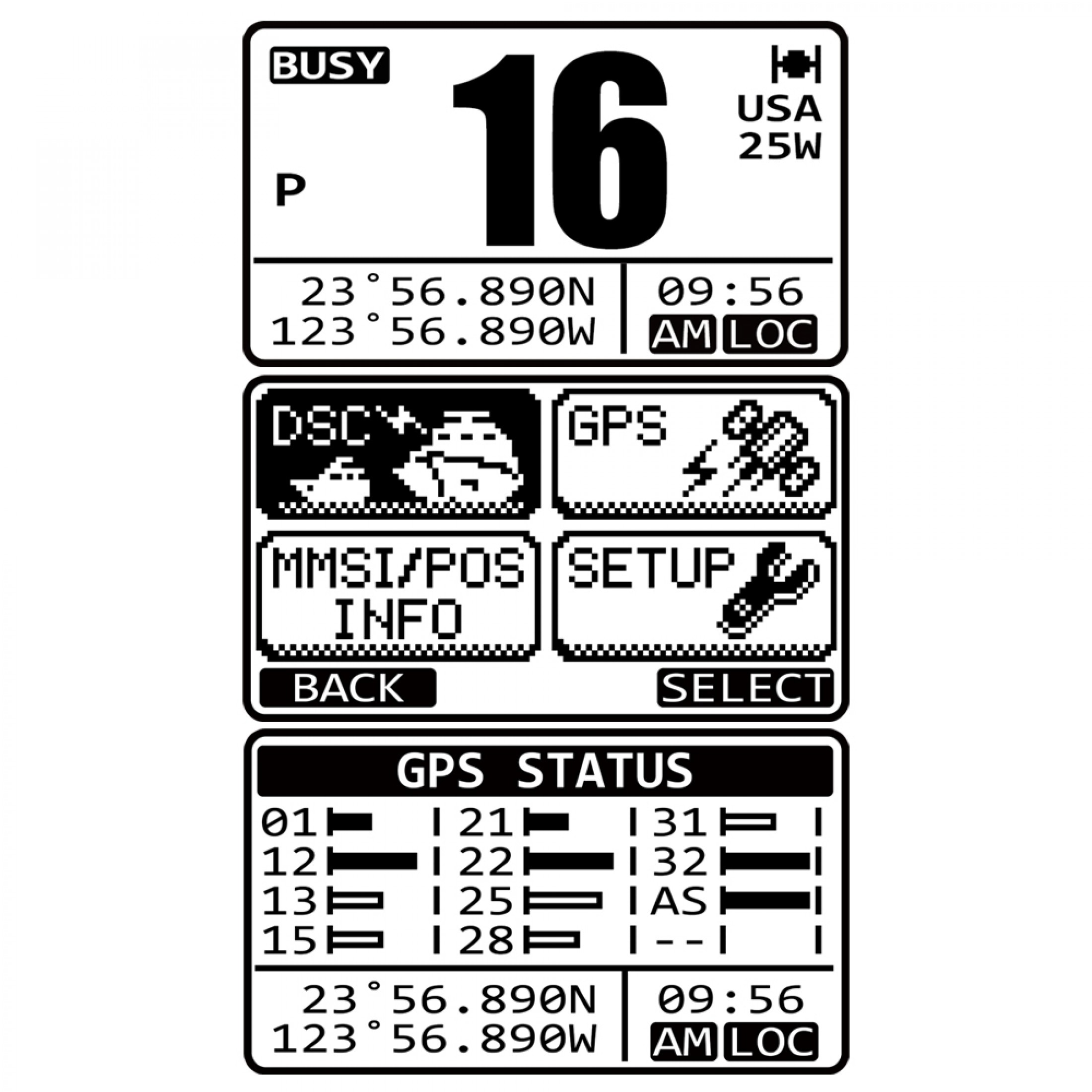The DSC DISTRESS function when activated transmits a digital MAYDAY including vessel identification, Latitude / Longitude and time (with GPS connected), to facilitate prompt response. Additional calls that can be made are Individual, Urgency, Safety, Position Report and Send.