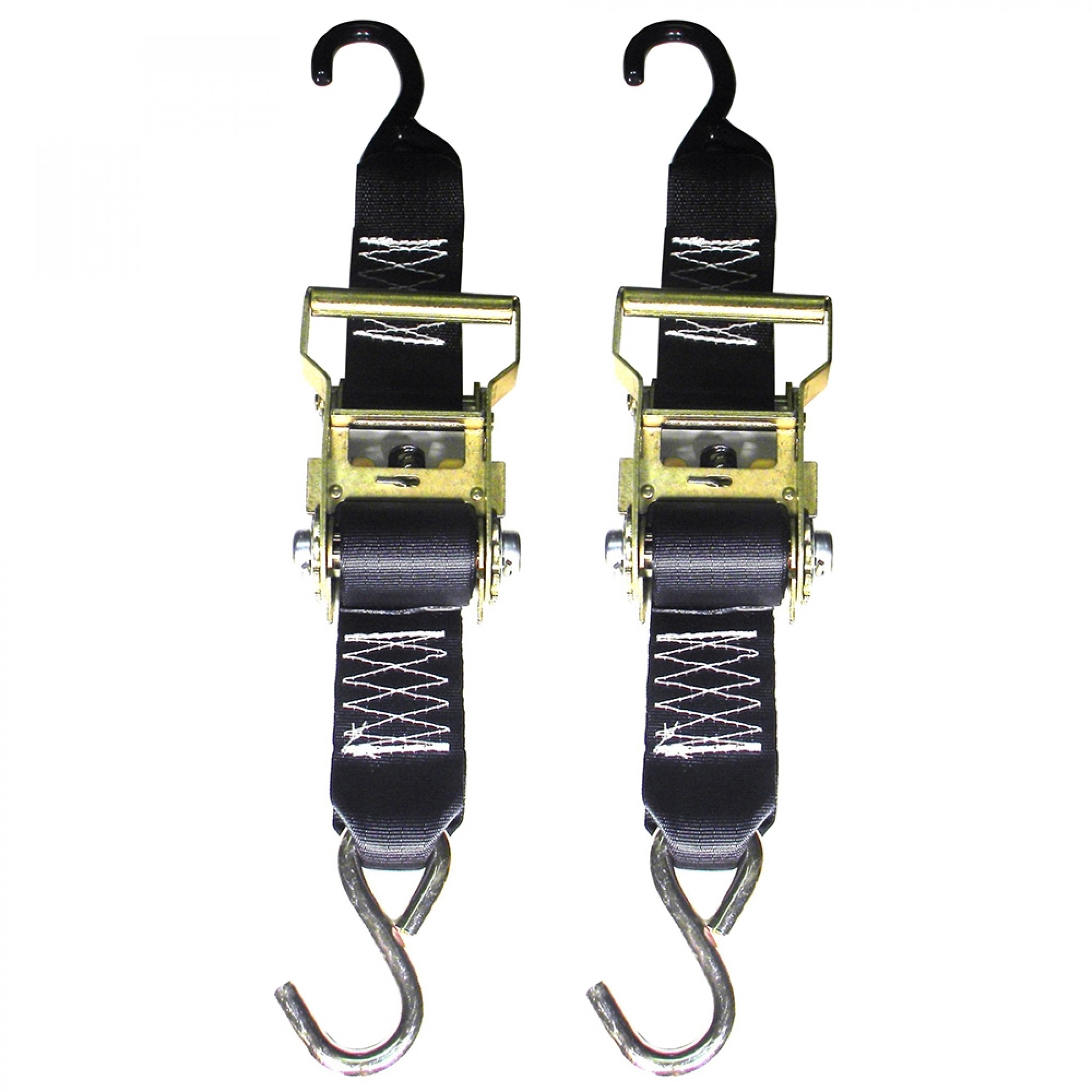 This heavy duty 2” x 5' ratchet tie-down is ideal for medium to large runabouts, pontoons or cuddy cabins. It features American made heavy vinyl coated top hook and zinc plated bottom hook. 2,400 lb. capacity - sold in pairs.