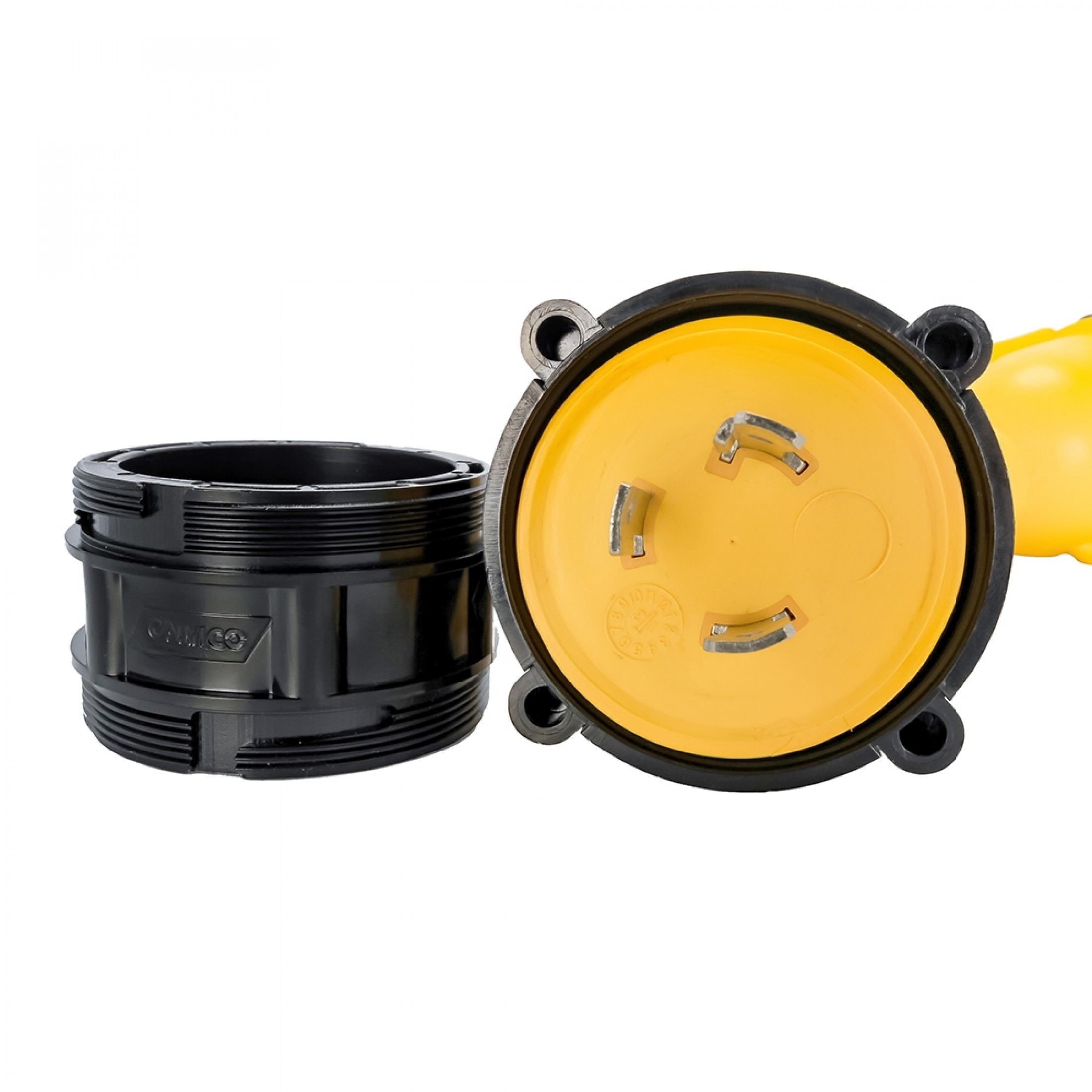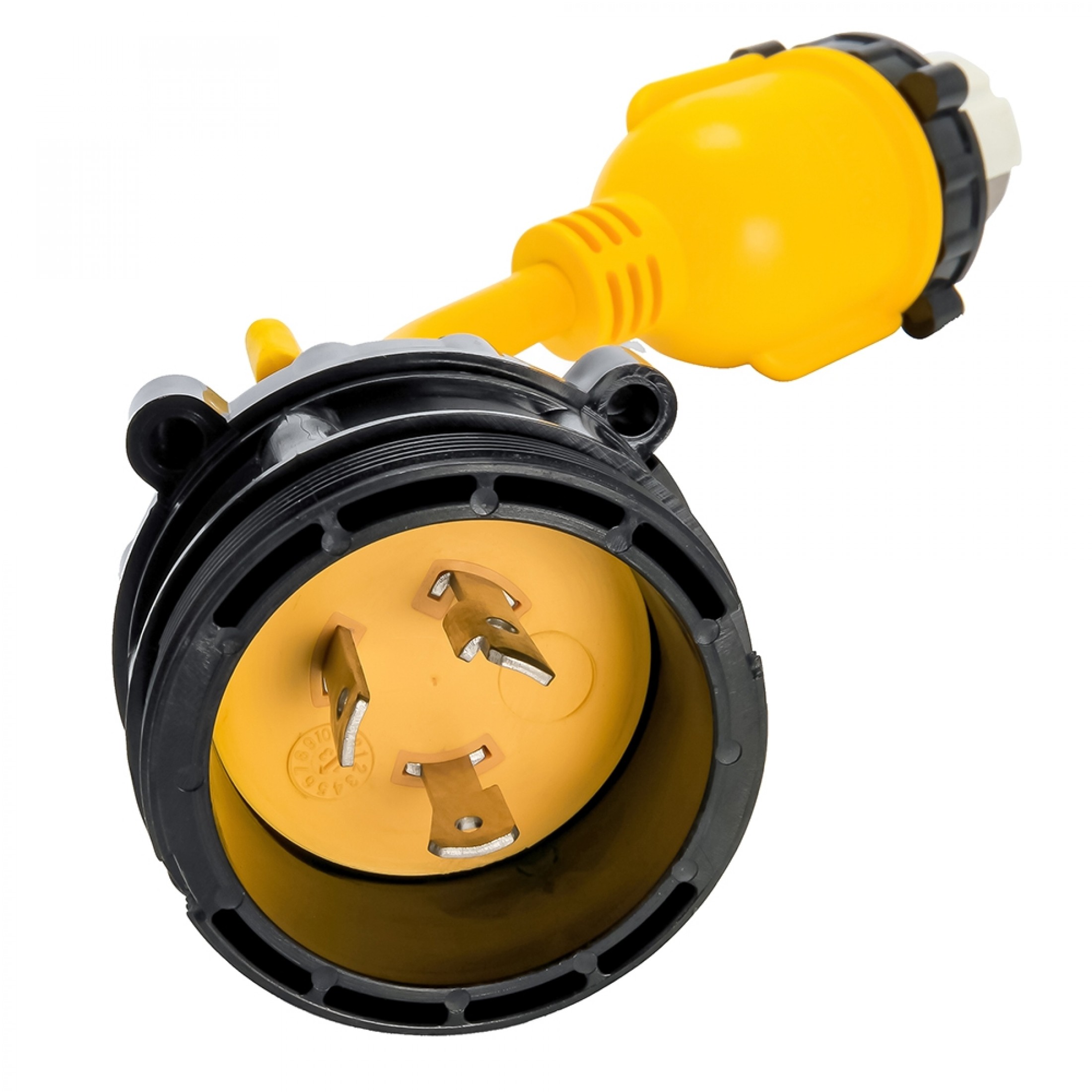The Camco 30-amp male/50-amp female Locking Adapter is a 12" adapter cord with a threaded locking ring that creates a weatherproof connection. The durable, long-lasting STW cord has a 180 degree turn from male to female end.