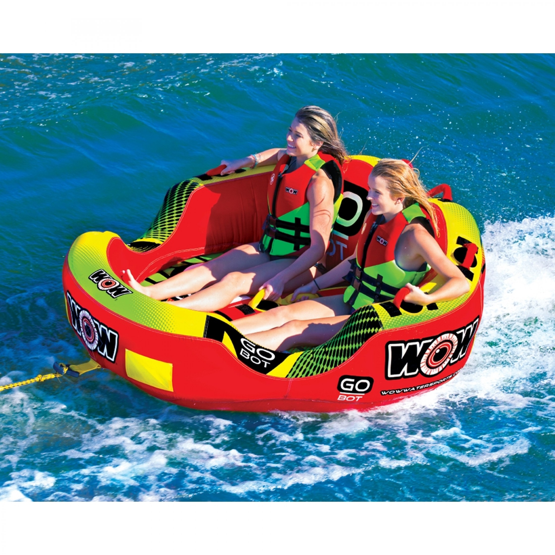 Get going on the water with the Go Bot Towable from WOW. Designed with family fun in mind, the Go Bot makes a great towable for the youngest to the oldest in the family. Ride in the seated position from the front tow point or connect the rope to the back tow point and ride chariot style. The deep cockpit seating with high backrest makes the riders feel more secure while the drop speed bottom glides smoothly over the water creating less drag on the boat and therefore better gas mileage.