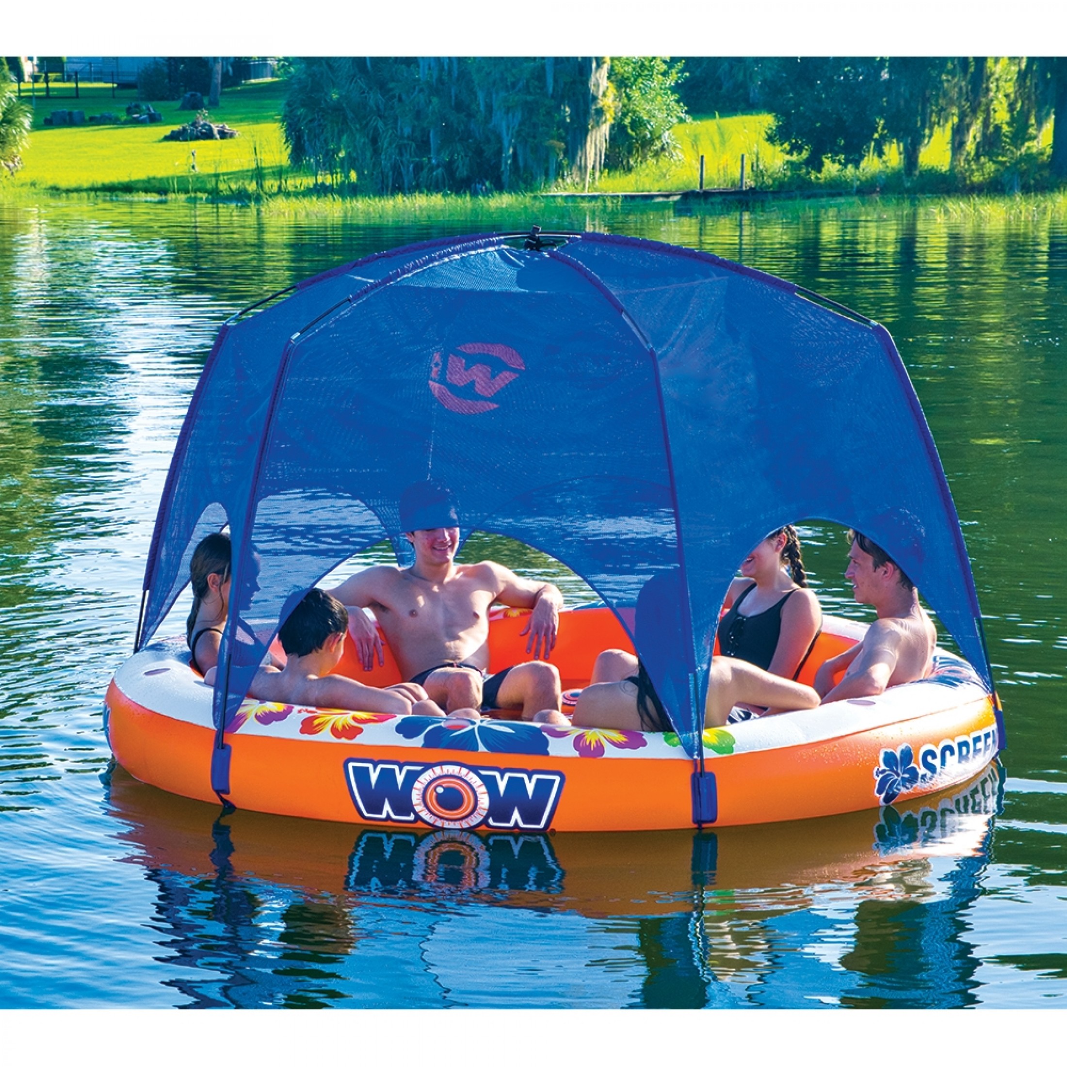This HUGE inflatable is paired with a mesh canopy, the Screen House lounger is perfect for everyone. The thick ring around the float acts as a backrest, has cupholders all around and the Screen House canopy shade, if desired. Along with 6 comfortable mesh seats to keep you cool on hot summer days, the inflatable floating island features an open center oasis. The space offers great leg space and allows your feet to dangle in water.