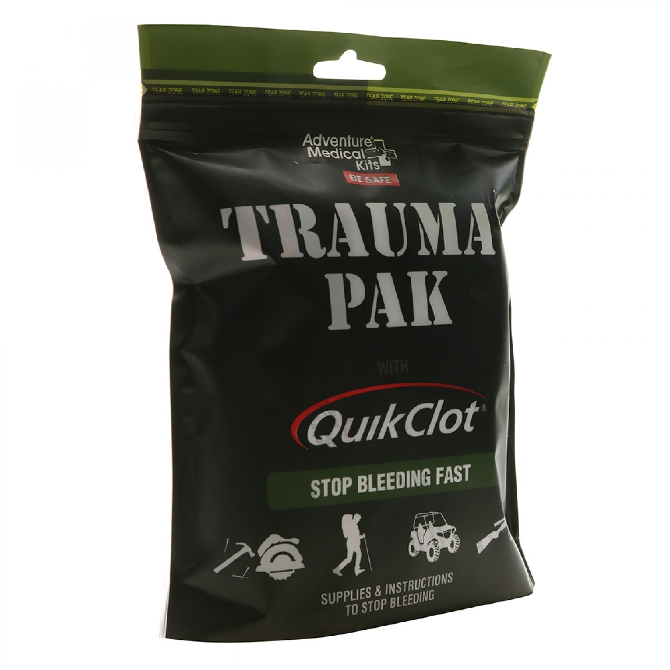 Packed in a tough, waterproof, pocket-sized pouch, the Trauma Pak with QuikClot® is easy to use: simply open, remove and apply. Also included is an information pamphlet on treating injuries.