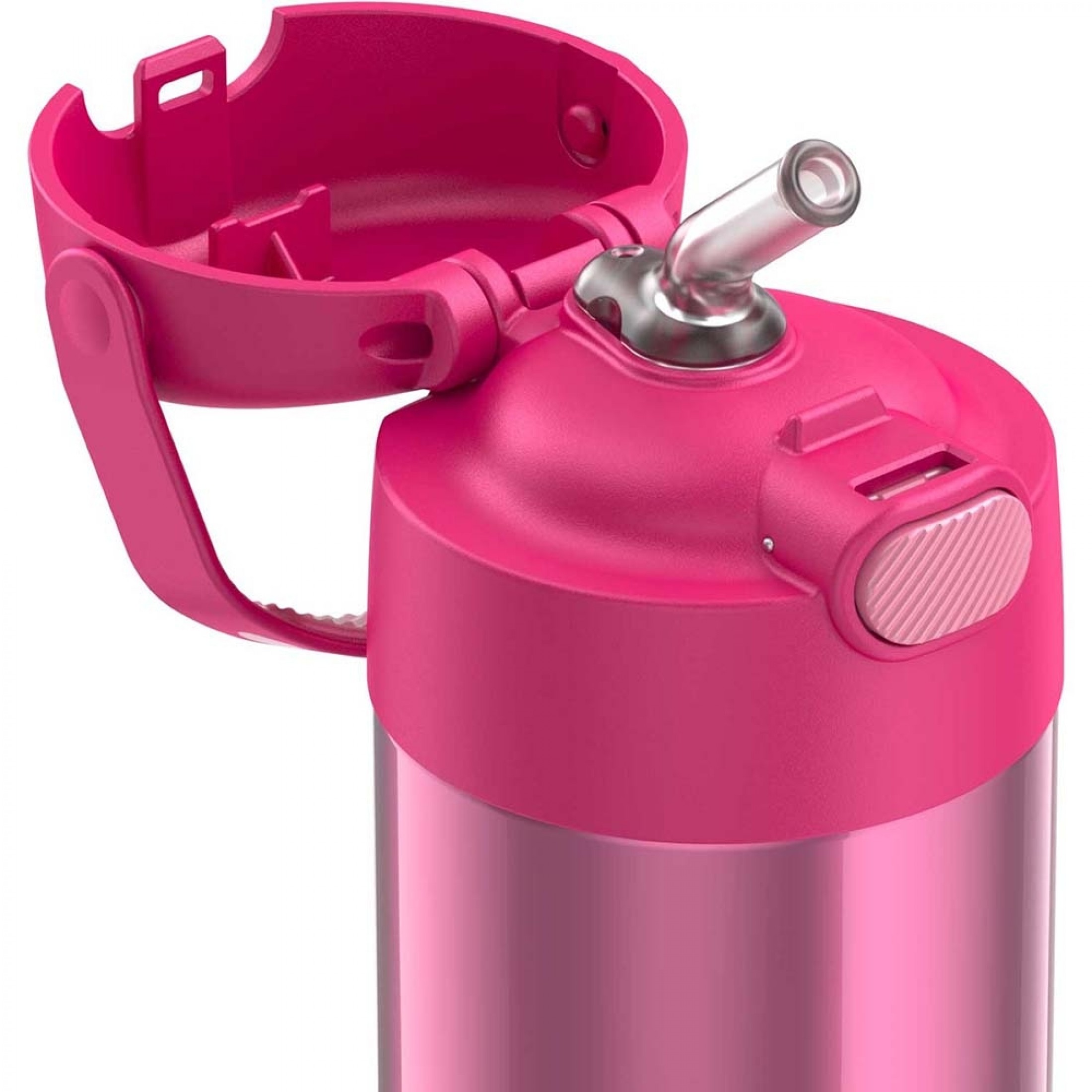 The FUNtainer® 12oz Vacuum Insulated Stainless Steel Water Bottle with Straw keeps drinks cold for up to 12 hours. The double-wall stainless steel construction is built to handle drops, dings, and assorted roughhousing. Includes an integrated carry handle with a soft-touch grip, making it easy for kids to carry with them throughout the day. Help keep germs away with the hygienically covered silicone straw which is removable for easy cleaning. To clean, you can pop your FUNtainer water bottle in the dishwasher; however, hand washing is recommended. Not for use with hot liquids.