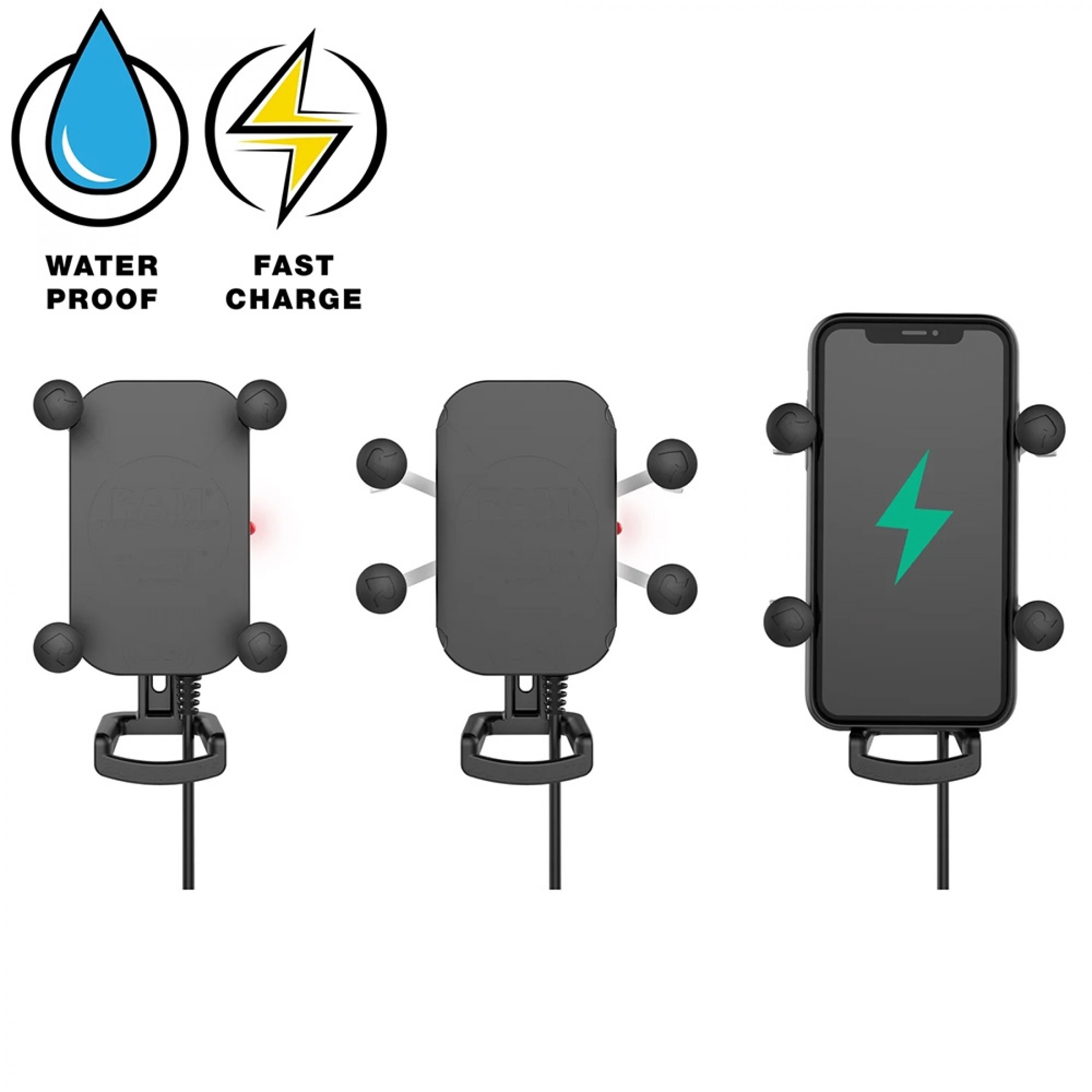 - Waterproof Qi-compatible wireless phone charging cradle features spring-loaded RAM® X-Grip® technology and 15W maximum output
