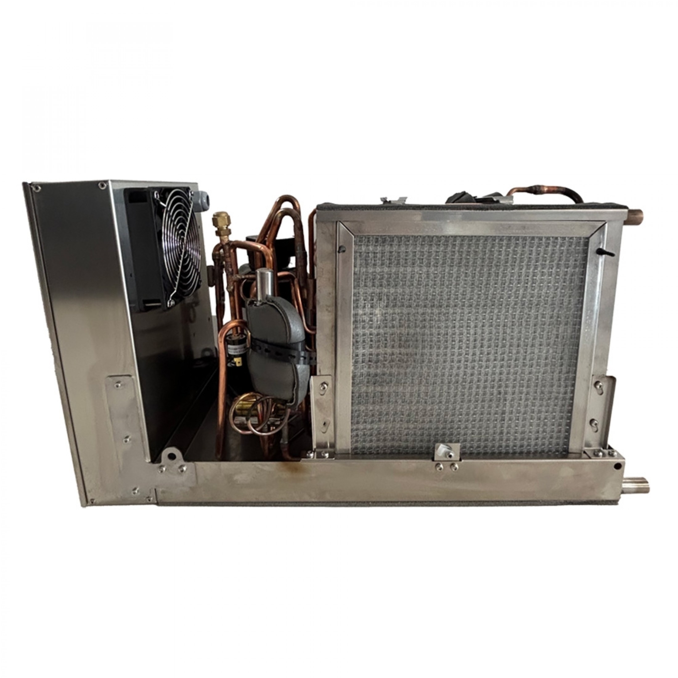 The twin rotary compressor with a brushless permanent magnet synchronous motor (PMSM) varies its rotation speed to continuously adapt to the difference between the set/requested temperature and the ambient temperature detected by the sensor integrated into the control panel. This ensures highly precise room temperature control in all conditions, with minimal noise and vibration. The outgoing air flow is kept constant thanks to DC brushless variable speed technology fans, which can be rotated for easier on-board installation.